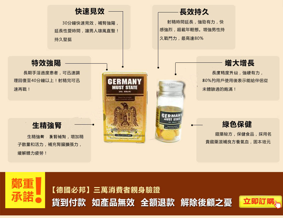 德國必邦于2013在美國上市販售,一上市就獲得超強超好效果的高度評價!經過多年年的市場開拓與臨床試驗,德國必邦中「靶向活性肽」針對男性陽痿 不舉症狀、早洩不持久、陰莖短小的男性有特效,故在2016在台灣地區成立進入大樹藥局販售,請認準本網『https://grtre.com』是台灣唯一正品販賣中心!