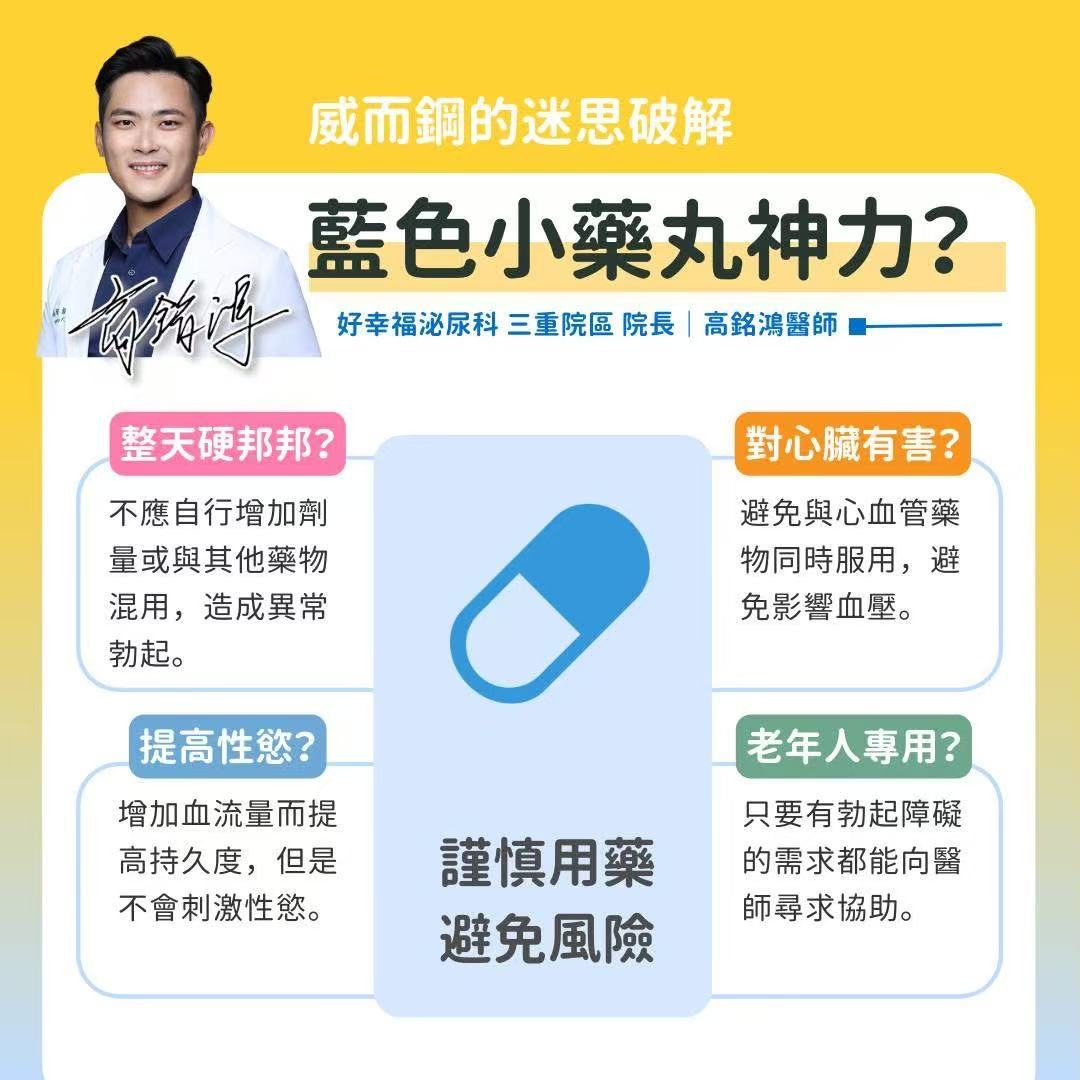 許藍方提醒男性朋友,除了威而鋼之外,像是犀利士、威樂壯等藥物都是處方藥,因此務必由醫師開立後經指示服用,千萬不能拿別人的藥隨便吃;正在服用高血壓、心臟血管藥物的人,不可以和威而鋼一起服用。